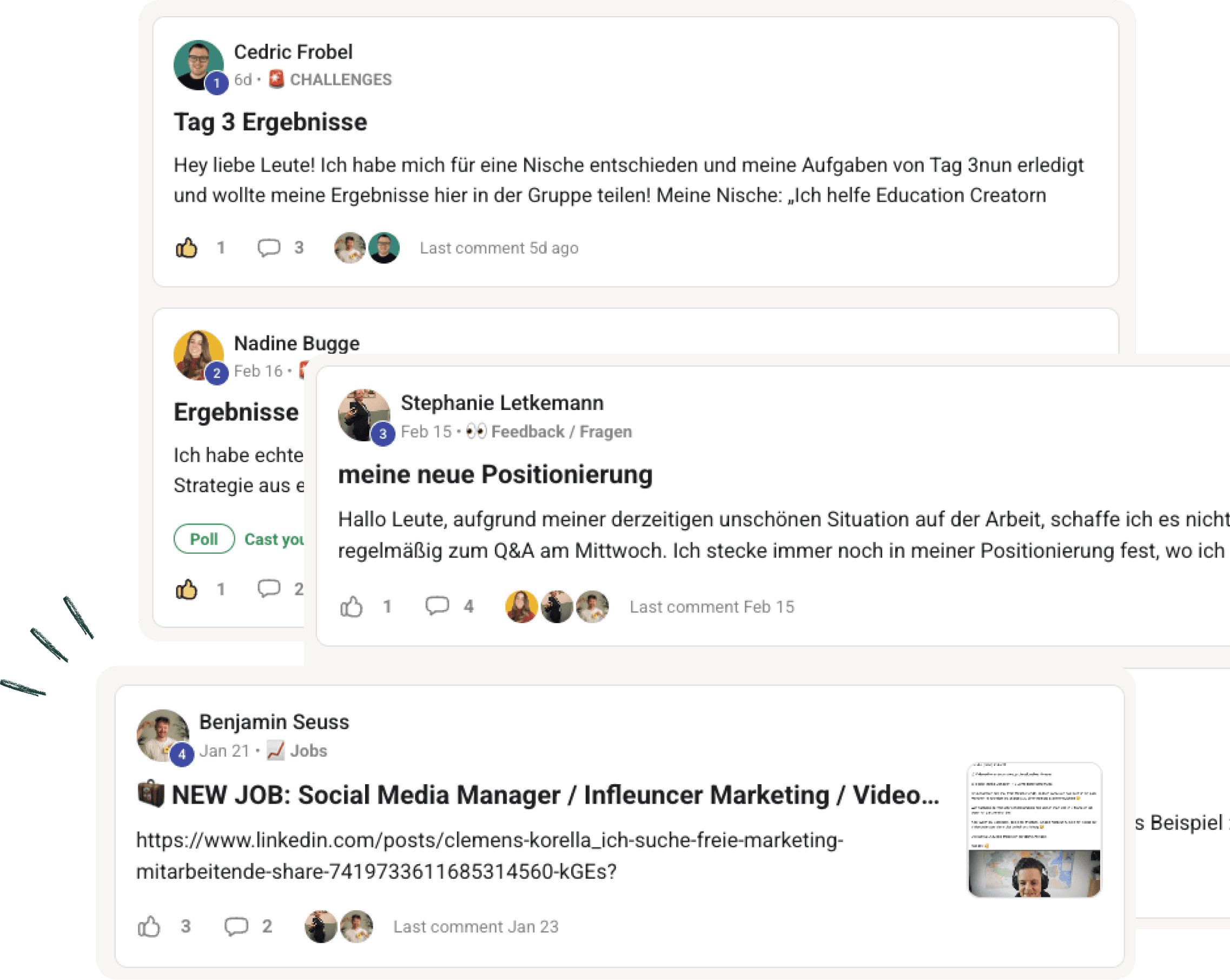 Kein Kurs-Friedhof. Die Inhalte entstehen aus echten Problemen echter Teilnehmer. Ich bin aktiv dabei – nicht als Aushängeschild das alle drei Monate auftaucht.